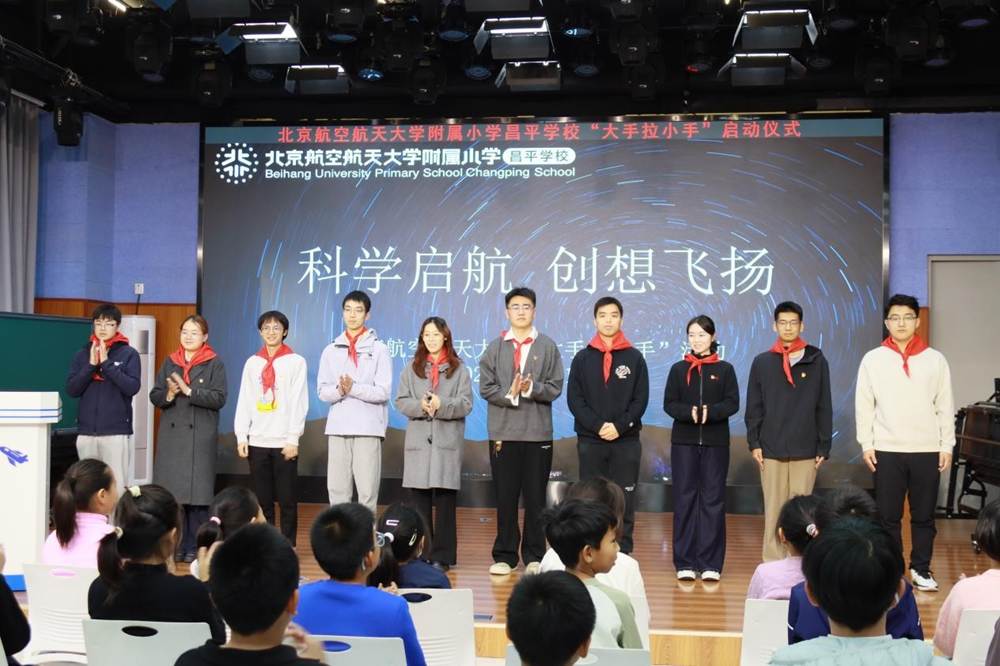 仪式伊始,少先队员为大学生辅导员代表佩戴上红领巾。这一抹红色,连接起“大手”与“小手”,也连接起科学探索的接力棒。