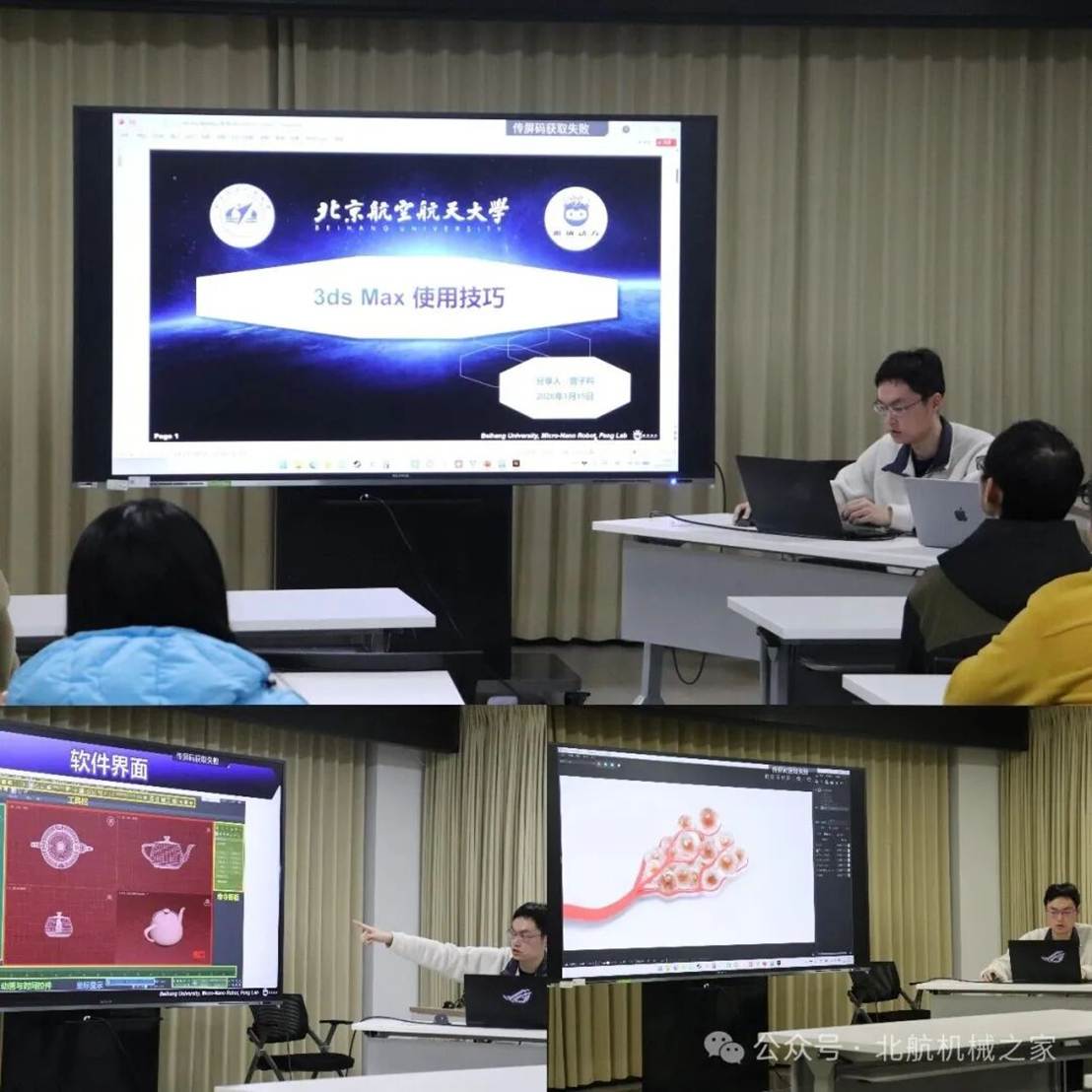 曾子衿:3Ds Max使用技巧。博士生曾子衿围绕“3Ds Max使用技巧”进行分享。他以“所见即所得”的三维建模软件3Ds Max为对象,选取带有血管结构的细胞团簇模型作为案例,系统展示了从模型建立、材质与纹理设置,到环境光源与相机参数配置,直至最终渲染输出的完整建模—渲染流程。通过清晰的步骤拆解与效果对比,他直观呈现了三维建模在科研示意、成果展示等方面的应用价值,为科研可视化表达提供了新的思路。