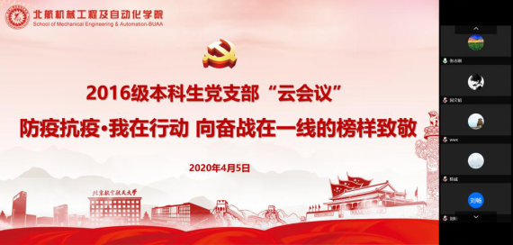 4月5日晚,机械工程及自动化学院2016级本科生党支部围绕“防疫抗疫·我在行动——向奋战在一线的榜样致敬”主题开展支部云视频会议。