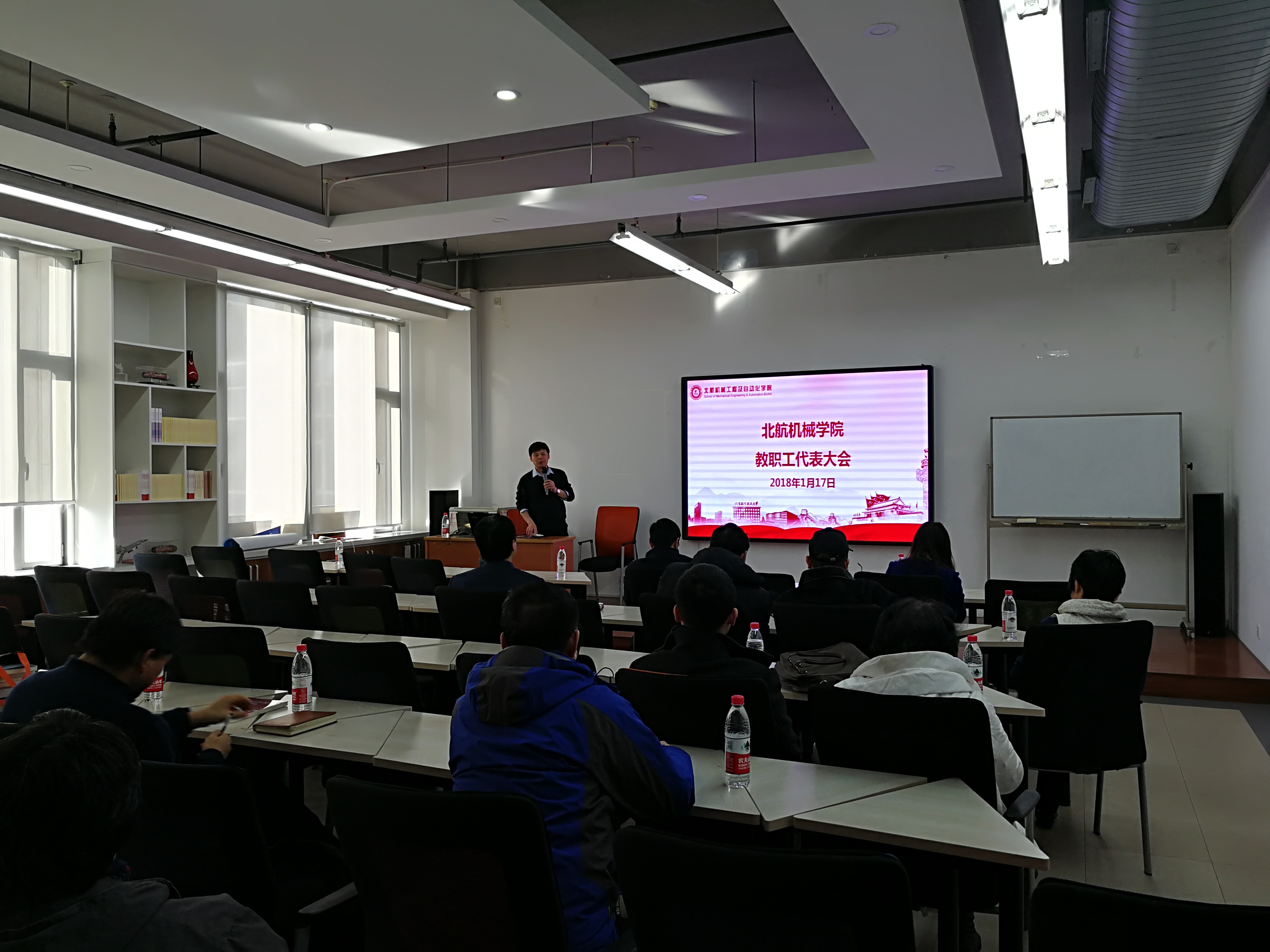 2018年01月17日,机械学院教代会召开,学院教代会代表20余人参加了会议。会议由学院工会副主席梁永建主持。我院院长丁希仑、院党委书记邓怡、副院长周正干、各系主任、所长、系所书记等出席。教代会会议由院党政办主任梁永建主持。