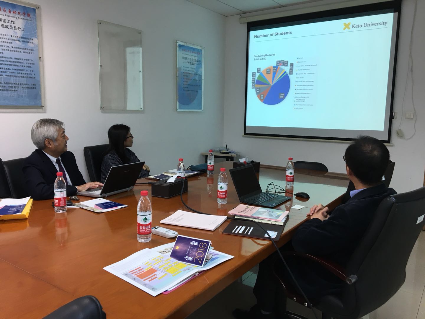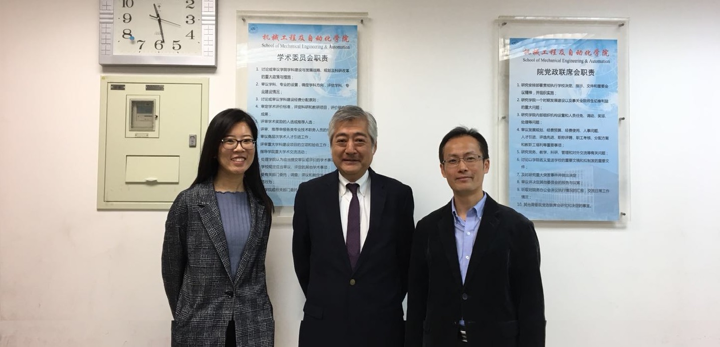 2018年10月11日,日本庆应义塾大学国际处处长、机械工程系主任小尾晋之介教授在我校国际交流合作处专家交流科科长陈璀老师的陪同下,参观我院,并与主管外事工作的蔡军副院长进行友好地交谈。