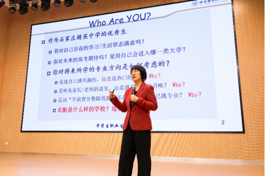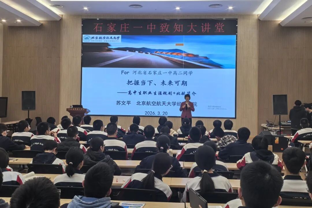 在石家庄精英中学,苏文平教授做客“精中名家讲坛”,围绕“认识自我”“了解外部世界”“科学决策”三个维度展开讲解。通过丰富的案例故事,苏文平生动呈现了不同性格、兴趣、能力特质的人在成长道路上的选择与收获。讲座中,苏文平结合戚发轫院士、桂海潮教授等北航杰出校友的成功案例,帮助同学们厘清了兴趣、专业与职业之间的内在逻辑。