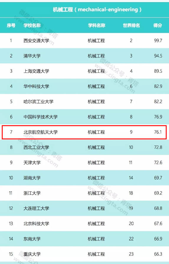 排名显示,北航有1个学科(机械工程)进入世界前十位。