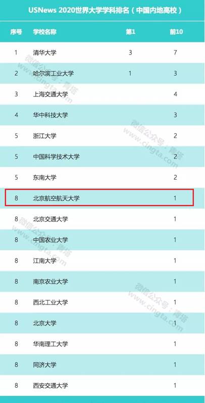 USNews2020年世界大学学科榜,北航跻身国内第八
