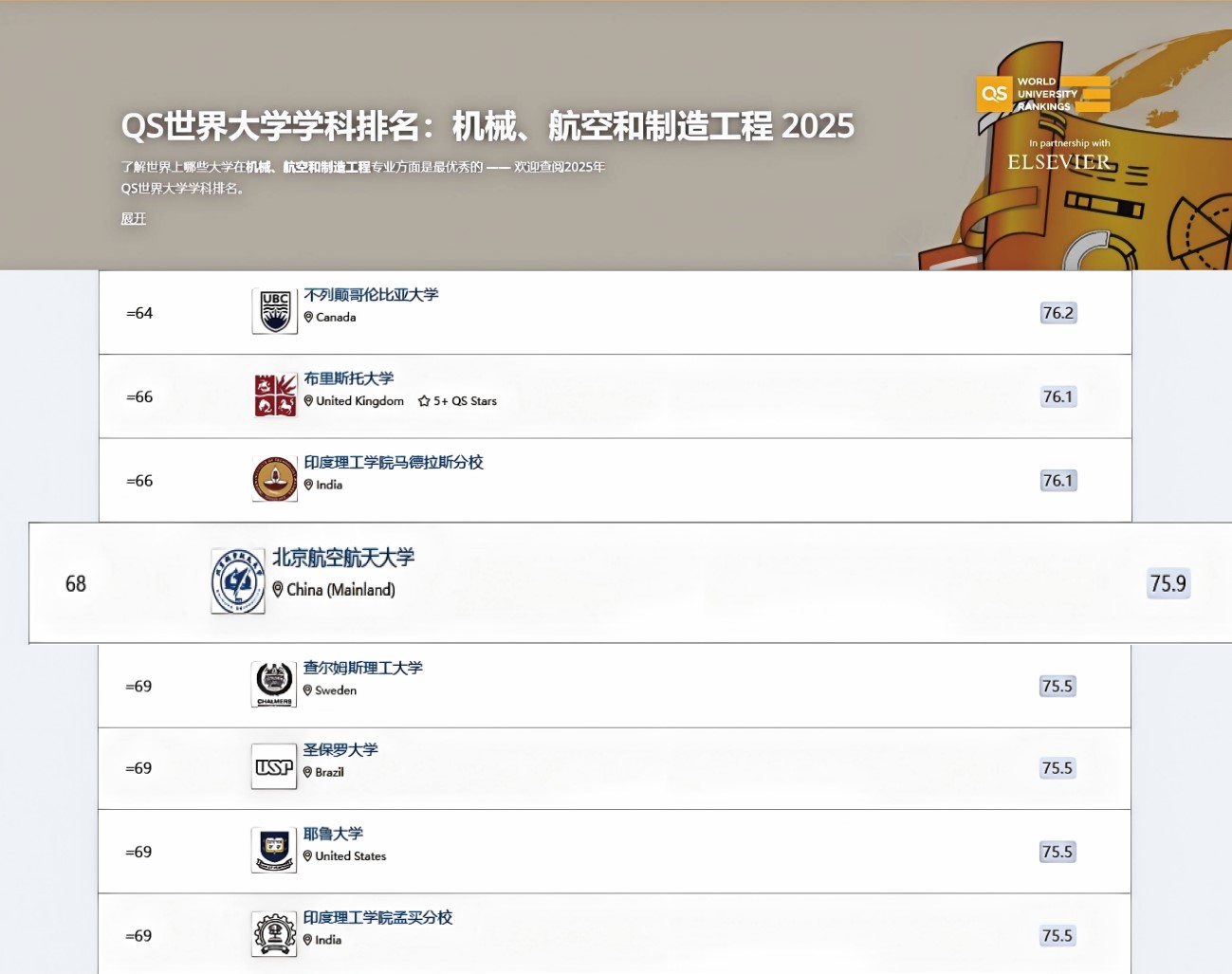 QS世界大学学科排名(2025)已于日前发布,涵盖工程与技术、艺术与人文学科、生命科学与医学、自然科学、社会科学与管理五大领域55个独立学科。北航机械工程及自动化学院的机械工程(Mechanical Engineering)学科位列第68,学科排名稳步上升(2024年91位)。