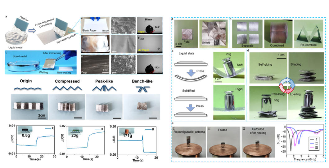 面向液态金属与典型功能材料体系(如金属、玻璃、有机弹性体等)间的复合难题,根据界面相互作用发展针对性复合方法,提出了一种无需外加材料或电/磁场的基于力响应的液态金属大面积快速普适化印刷方法,实现了不同种类液态金属(EGaIn、BiInSn)在润湿性极差的纸张等基底上快速、稳定的复合方法,并根据应用需求针对性构建兼具多场响应性、可重构及自修复等多种功能的智能材料体系,并实现从微观界面到宏观结构的多尺度设计策略。