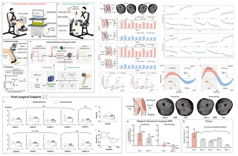 传统等速康复训练设备体积巨大使用成本高昂,在此背景下,团队开发了一种轻便的床旁等速抗阻训练机器人,针对传统等速设备关节无柔性、能耗高的问题,一方面在等速训练机器人中创新加入轻便紧凑且变刚度范围达5.0-137.3 Nm/rad的变刚度机构,提升人机交互柔顺性与安全性,并拟定兼容患者差异的最优刚度测定方法,为个性化训练提供新思路;另一方面基于动态电能再生实现等速控制,在不额外增加硬件结构的前提下回收人体抗阻能量供电,显著延长续航(120°/s 速度下提升57.8%),优化人机能量利用效率。